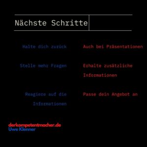 Nun magst du denken, bei der Präsentation meines Angebotes muss ich doch mehr reden. Doch wie oft stellst du Fragen, bei denen dein Kunde seine Gedanken noch einmal aussprechen kann und du weitere Informationen erhältst und gleich darauf reagieren kannst?
